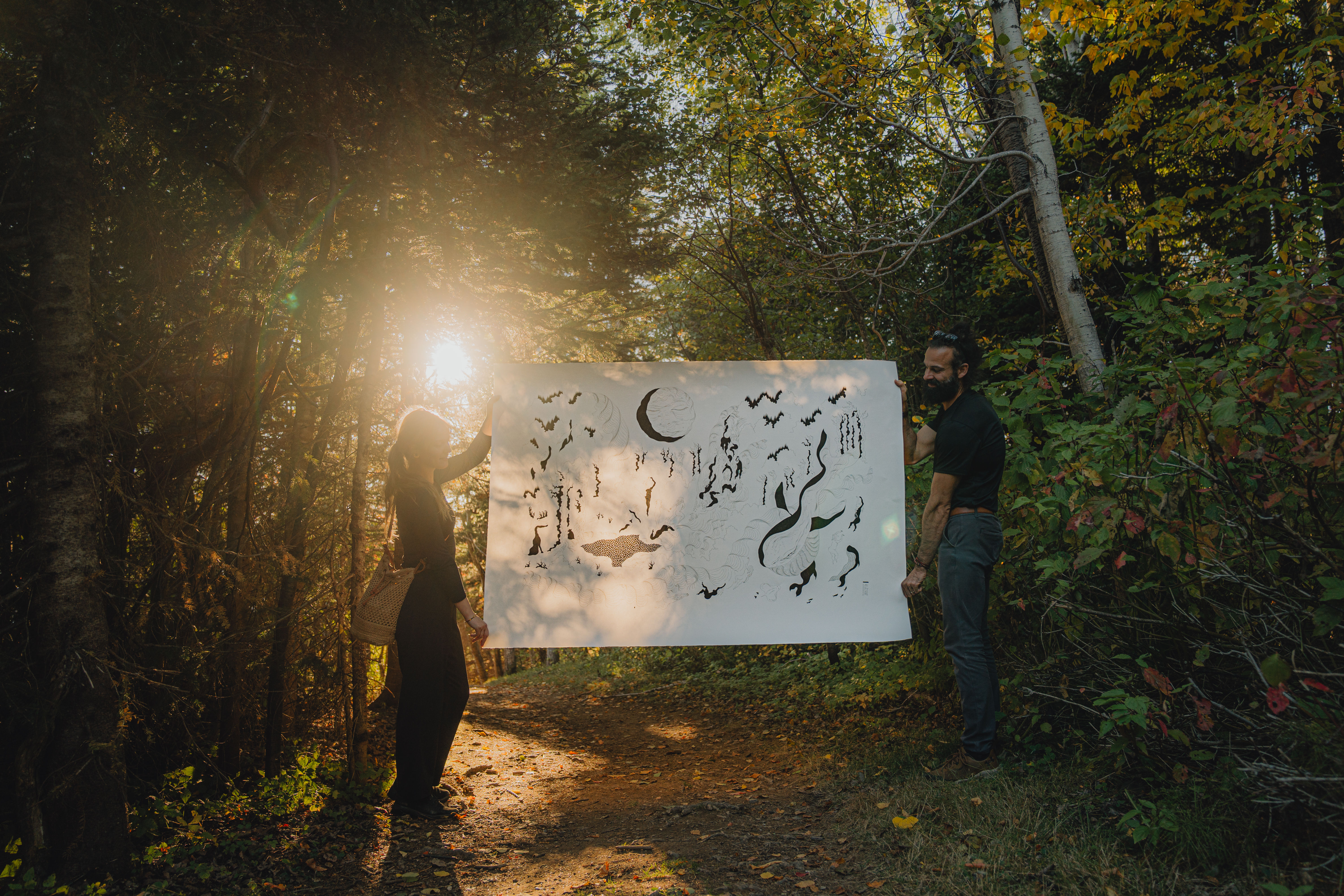 Ces illustrations racontent la poésie des grands espaces, celle qui traverse le corps et l’âme. Tous les dessins sont en noir et blanc, réalisés à l'encre sur du papier, minimalistes et épurés, jouant de cette dualité ombre-lumière, aux mêmes teintes que les longs hivers gaspésiens. Les cartes postales sont quant à elles de petites scènes de vie gaspésiennes : des moments de contemplation, de silence, d'amour et de partage.